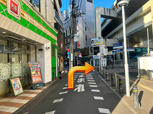 30mほど進み、パチンコ店さんなどがある交差点を右折します。高架下で川と橋がある方向へお進みください。