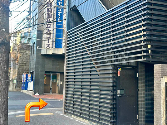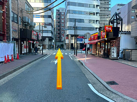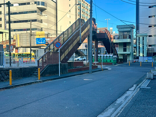 歩道橋を渡ったら、進行方向を変えず、横浜駅や通ってきた首都高の高架下を背中に向けた方向へ進み、30mほど先にある最初の通りを右折します。