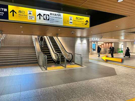 地上に出る階段は上らず、西口地下通路を真っ直ぐお進みください。 -