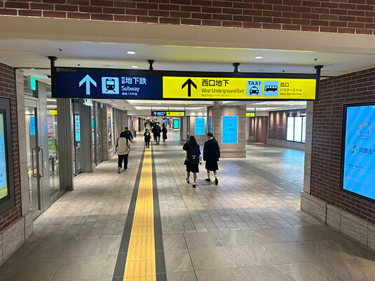 雨の日は西口地下通路からお越しいただくと、屋外を歩く距離が短いです。