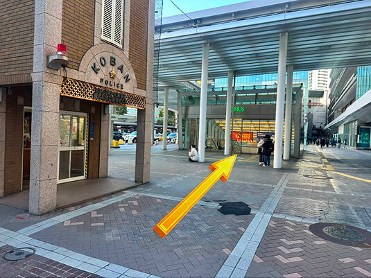 地上からお越しになる場合は、交番の近くにある階段から地下に降りて左手側(横浜駅を背中にする方向)へ進みます。