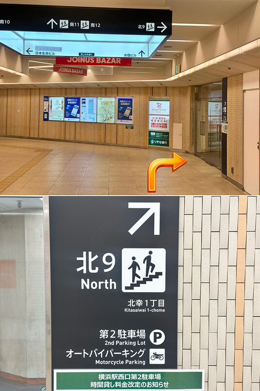 横浜駅西口から地下通路を真っ直ぐ歩くと、途中で右側に「ヨドバシカメラ様」と「みずほ銀行様」がありますが、そのまま真っ直ぐお進みください。